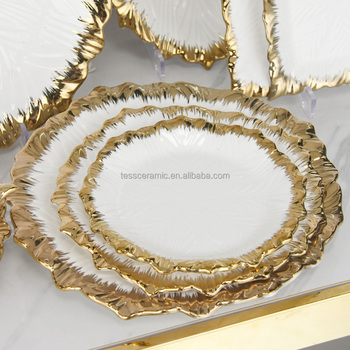 ชุดจานและจานอาหารขอบสีทองแบบไม่สม่ำเสมอสำหรับร้านอาหารชุดเครื่องใช้บนโต๊ะอาหารสำหรับงานแต่งงานจานอาหารค่ำทำจากเซรามิกสวยงาม RCY003-plateR